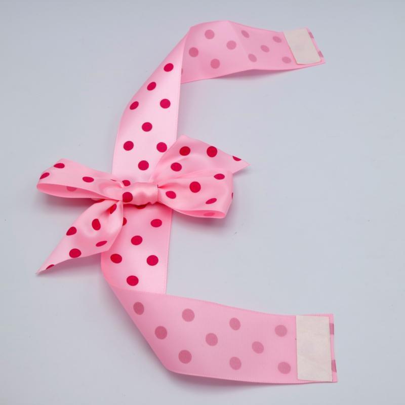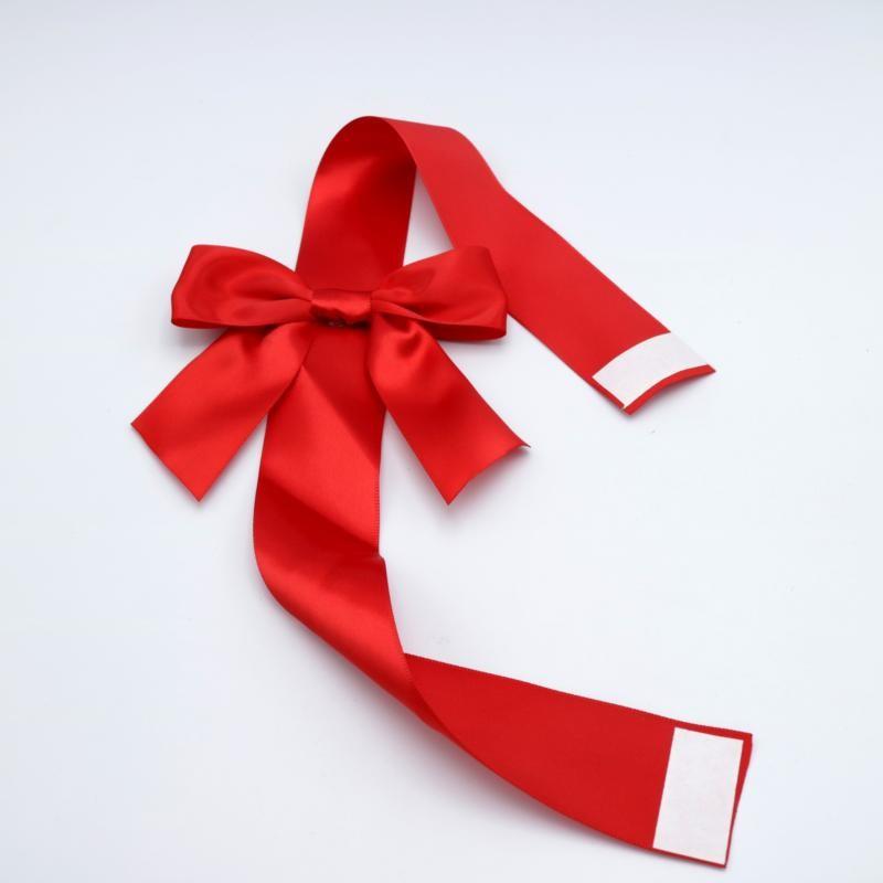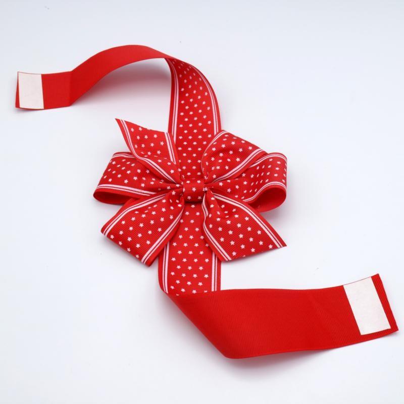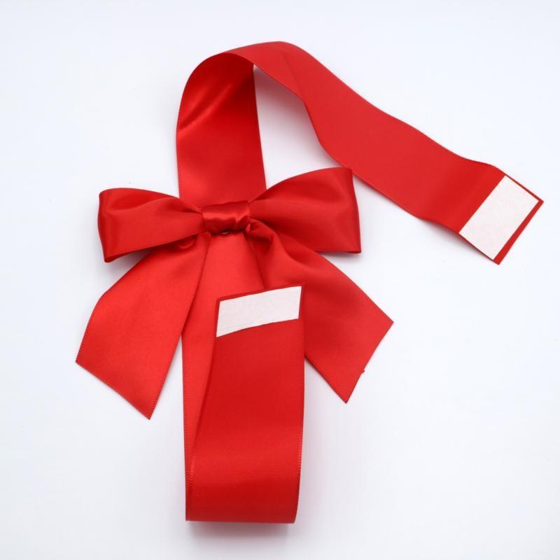 Ribbon Bow with Verticle strip and double face sticker on both ends. The sticker is strong enough and easy to handle with, to fix the bow on the box.